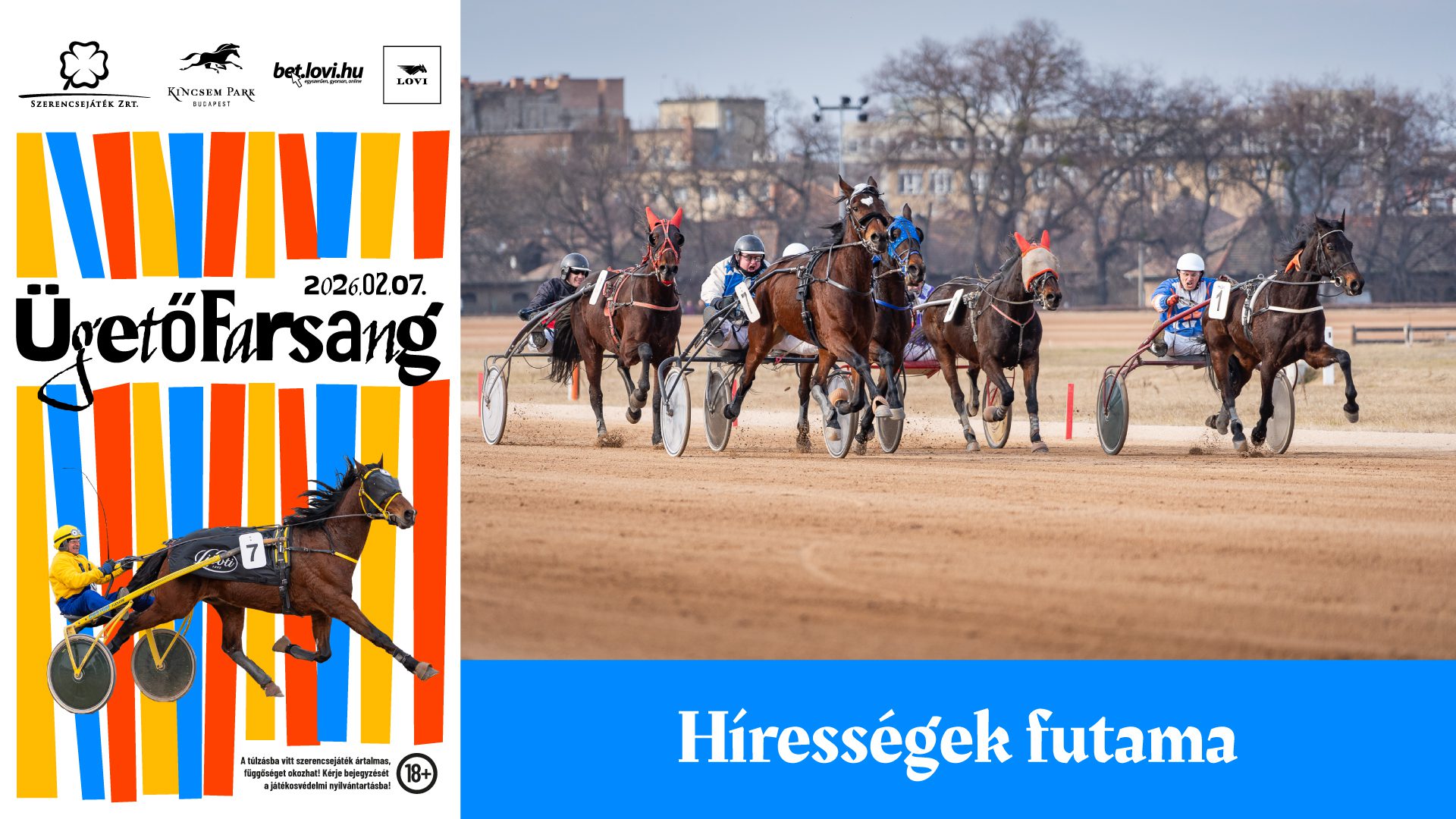 Az ügetők pedig mindent megtesznek, hogy ezúttal is elkápráztassanak! A Tippmix – Hírességek Futama Hendikepben pedig Baji Balázs, Burucs Borbála, Eper Márton, Epres Attila, Gajdos Tamás, Németh Gábor, Török Olivér, Urbán Flórián és Vida József csatázik a győzelemért!