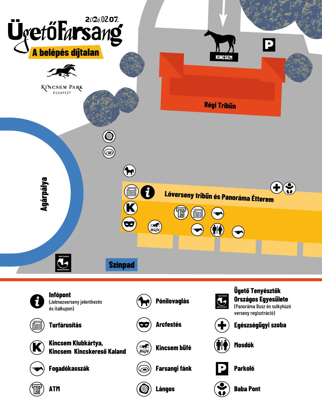 Az Aulában állítjuk fel az Infópontot, ahol megvásárolhatod a Turf Magazint, regisztrálhatsz Kincsem Park Klubkártyát, felveheted a jelmezedért járó italkupont, amennyiben az első 500 jelentkező között vagy, és itt regisztrálhatsz a színpadon zajló jelmezversenyre is. Az Aulában, a Turf Szalonban készülünk a gyerekek számára ingyenes arcfestéssel, álarckészítéssel, kézműves foglalkozásokkal és Kincsem Kincskereső Kaland túrával. Az udvaron pedig elcsípheted a gyerekek kedvenceit, a pónikat – közkívánatra ingyenes pónilovaglás a kicsik számára! A versenypálya szélénél található standnál az Ügető Tenyésztők Országos Egyesülete vár, náluk tudsz regisztrálni a sulkyhúzó versenyekre és itt fizethetsz be a Panoráma Buszra is (1000 Ft / fő / verseny, 14 év alatt ingyenes.)